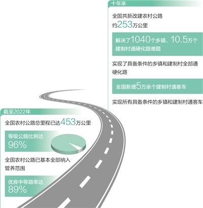 一條條“暢安舒美”的農(nóng)村公路化作一道道美麗風(fēng)景線,助推形成了一大批宜居宜業(yè)宜游的特色小鎮(zhèn)和美麗鄉(xiāng)村。截至2022年底,全國(guó)農(nóng)村公路已基本全部納入管養(yǎng)范圍,優(yōu)良中等路率達(dá)89%,農(nóng)村公路基本實(shí)現(xiàn)“有路必養(yǎng)、養(yǎng)必到位”。