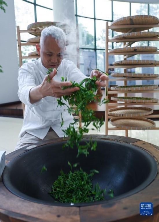 4月19日,婺州舉巖茶制茶技藝非遺傳承人潘金土在炒制婺州舉巖茶。