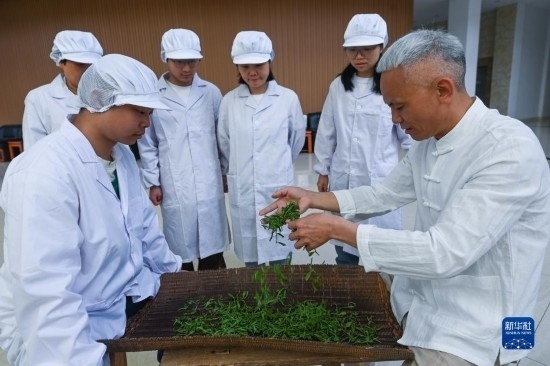 4月19日,婺州舉巖茶制茶技藝非遺傳承人潘金土(右一)給年輕人示范婺州舉巖茶的制作過(guò)程。