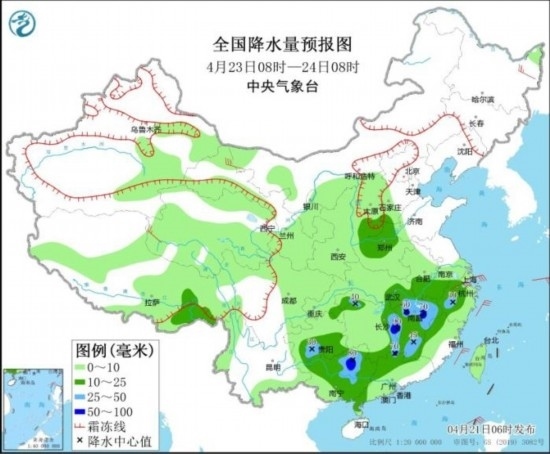 全國降水量預(yù)報(bào)圖(4月23日08時(shí)-24日08時(shí))