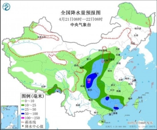 4月21日08時(shí)至22日08時(shí),新疆沿天山高海拔地區(qū)和南疆南部、西藏北部和東部、青海東部、甘肅中南部、寧夏、陜西北部、山西中北部等地部分地區(qū)有小到中雪或雨夾雪,其中甘肅南部、山西西部局地有大到暴雪(10~18毫米);西北地區(qū)東南部、華北中南部、西南地區(qū)東部、江漢西部、江南中南部、華南北部和東部等地部分地區(qū)有中到大雨,其中,四川盆地東部、重慶西部、湖南南部、廣東東部等地部分地區(qū)有暴雨或大暴雨(100~120毫米)。內(nèi)蒙古東北部、黑龍江東北部、浙江北部等地部分地區(qū)有4~6級風(fēng)。渤海海域、黃海海域、東海北部、臺灣海峽將有6~7級風(fēng),陣風(fēng)8~9級。