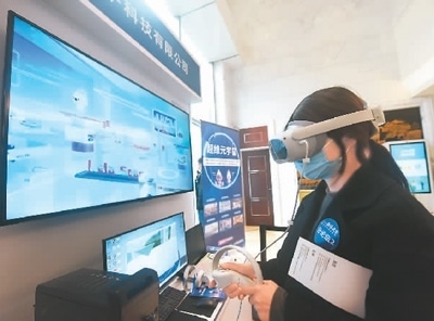 3月29日,在河北省雄安新區(qū)生態(tài)環(huán)境監(jiān)測中心內,環(huán)境監(jiān)測員借助VR(虛擬現實)設備輔助開展工作。本報記者 史自強攝