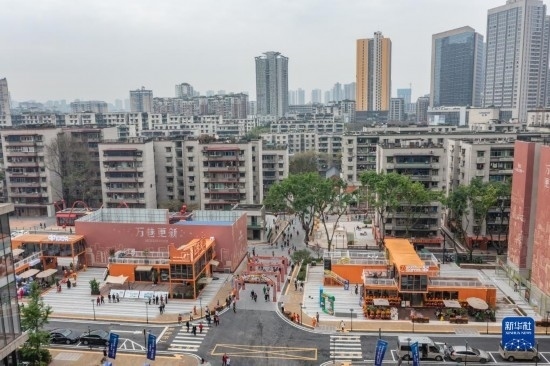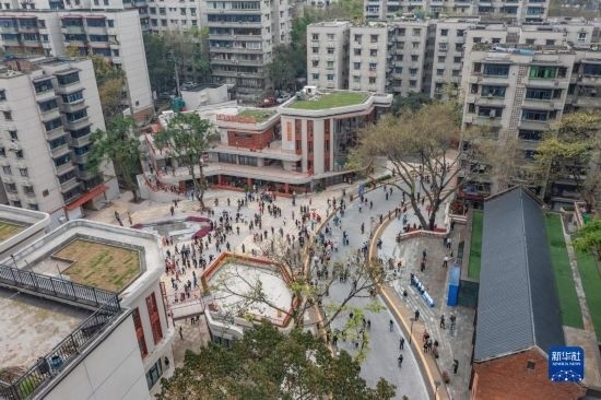 4月28日,在竣工亮相的重慶市九龍坡區(qū)謝家灣街道民主村片區(qū)城市更新項(xiàng)目(一期),人們?cè)谝惶幑部臻g休息(無人機(jī)照片)。