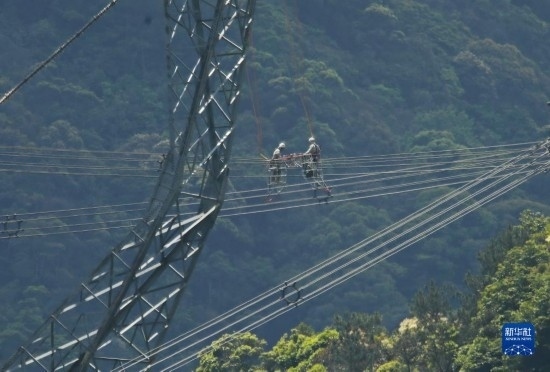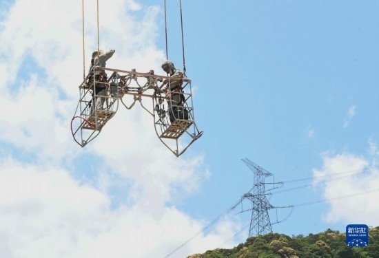 5月4日,在福建省寧德市洪口鄉(xiāng),國網福建超高壓公司帶電班檢修工周曉剛(右)對輸電線路進行帶電作業(yè)。