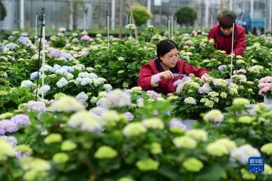 5月5日,在肥西縣經(jīng)開區(qū)一家農(nóng)林科技企業(yè),員工在花卉種植基地打理繡球花。