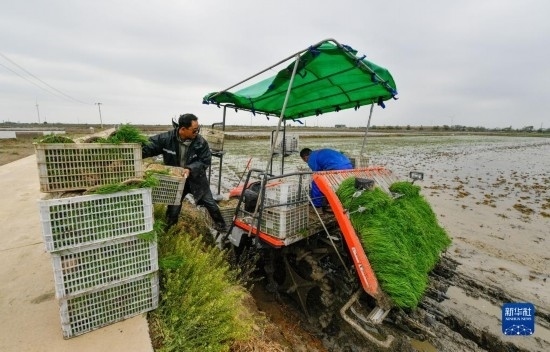 5月5日,在天津市優(yōu)質(zhì)農(nóng)產(chǎn)品開發(fā)示范中心,農(nóng)民將秧苗搬運(yùn)上插秧機(jī)。