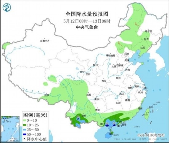 5月11日08時至12日08時,西藏北部和東部、青海南部等地部分地區(qū)有小到中雪或雨夾雪;西藏東南部、云南南部、江南南部、華南大部等地部分地區(qū)有中到大雨,其中,廣西東部和東南部沿海、廣東西南部、海南島東部等地部分地區(qū)有暴雨或大暴雨(100~120毫米)。內(nèi)蒙古大部、西北地區(qū)東北部、華北北部、遼寧等地部分地區(qū)有4~6級風(fēng)。