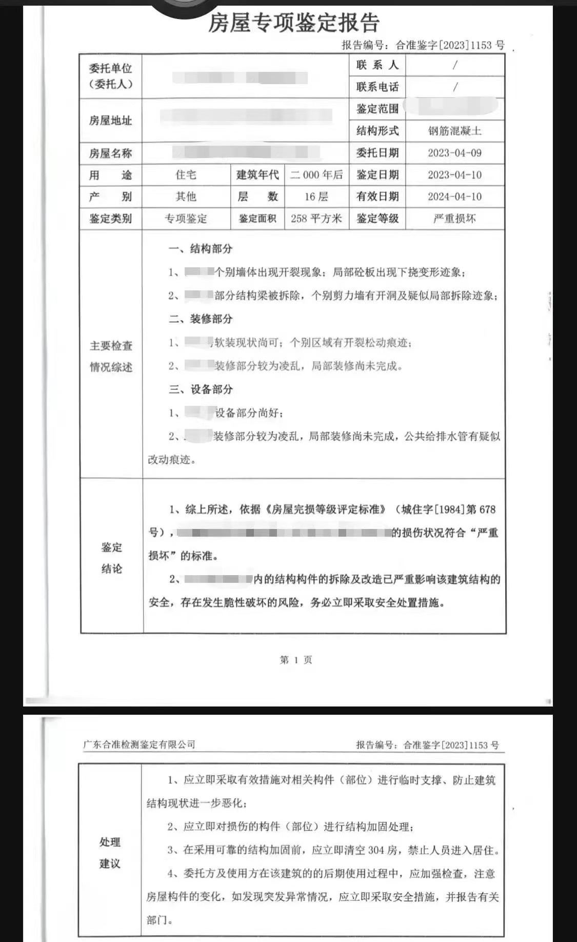 值得注意的是,發(fā)現(xiàn)204房的承重墻被拆后,有業(yè)主曾自費請鑒定機構(gòu)對204房、304房進(jìn)行安全鑒定。鑒定結(jié)果顯示,涉事房屋的損傷程度符合“嚴(yán)重?fù)p壞”的標(biāo)準(zhǔn);在采用可靠的結(jié)構(gòu)加固前,應(yīng)立即清空304房,禁止人員進(jìn)入居住。而在5月5日,永平街道辦在涉事樓棟貼出“致廣大居民朋友的一封信”,其中提到:4月8日至18日,已經(jīng)完成了臨時加固支撐工程,目前建筑物整體結(jié)構(gòu)穩(wěn)定可控,人員無需轉(zhuǎn)移,但需要盡快加固補強。