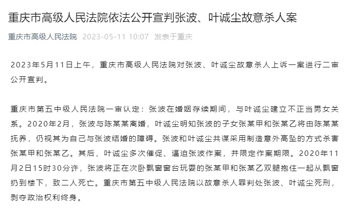 ·重慶市高級人民法院裁定張波、葉誠塵故意殺人案駁回上訴,維持原判。