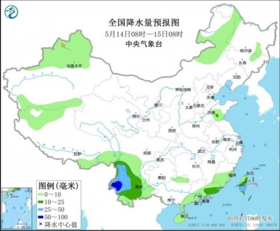 5月14日08時(shí)至15日08時(shí),西南地區(qū)南部、廣東東南部、臺(tái)灣島大部等地部分地區(qū)有中到大雨,其中,云南西南部等地部分地區(qū)有暴雨(50~70毫米)。新疆北疆北部部分地區(qū)有6~7級風(fēng)。
