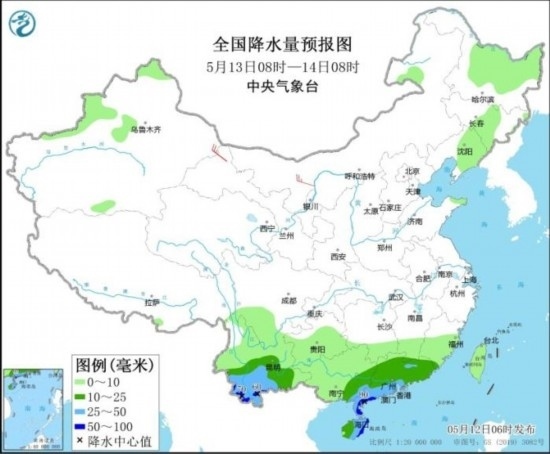 全國降水量預(yù)報(bào)圖(5月12日08時(shí)-13日08時(shí))