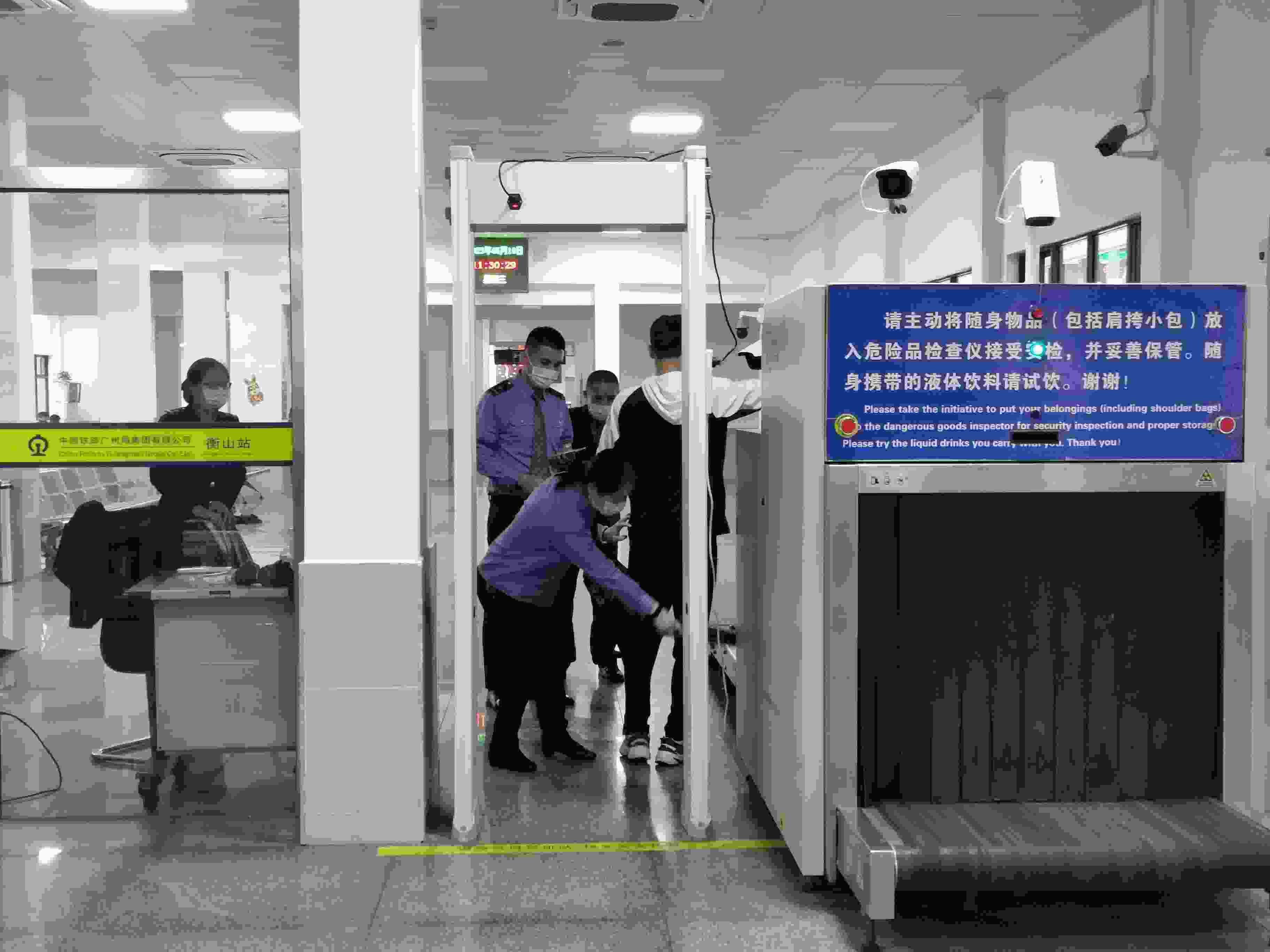 5月10日,衡山站的工作人員對進(jìn)站旅客進(jìn)行安檢。