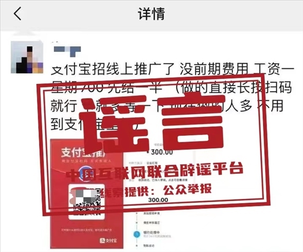 真相:近日,有網(wǎng)民向支付寶開放平臺反饋,看到有打著“螞蟻推廣”或“支付寶推廣”等旗號,聲稱“出租朋友圈可以賺取100/天”的推廣任務。對此,支付寶辟謠稱,此類活動均為詐騙,請勿輕信。