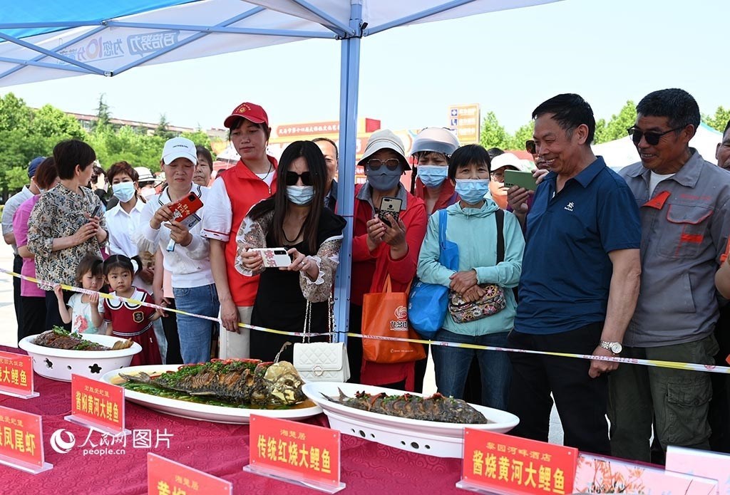 5月17日,“中國旅游日”主題周活動期間,河南省義馬市舉辦“櫻紅五月”美食節(jié),集中展示當(dāng)?shù)氐奶厣朗场⒚麅?yōu)特產(chǎn),為了讓游客有更好的體驗(yàn),當(dāng)?shù)?2家飯店還進(jìn)行了精彩紛呈的廚藝大比拼?;顒蝇F(xiàn)場,游客在圍觀經(jīng)典豫菜“紅燒黃河大鯉魚”。人民網(wǎng)記者 王玉興攝