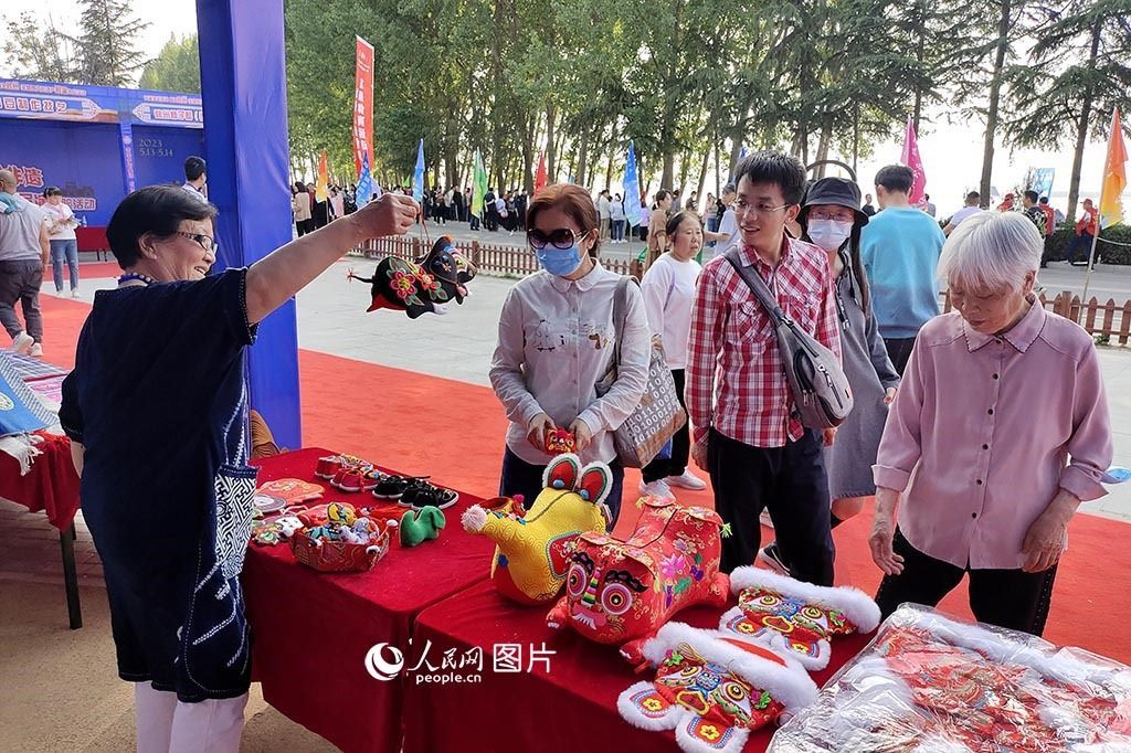 5月14日,“中國旅游日”主題周活動期間,河南省三門峽市陜州區(qū)在黃河岸邊舉辦“傳承多彩非遺”魅力陜州非物質(zhì)文化遺產(chǎn)展演體驗(yàn)活動,大展傳統(tǒng)藝術(shù)魅力,為群眾獻(xiàn)上了一場“非遺文化盛宴”。在活動現(xiàn)場,當(dāng)?shù)厥〖壏沁z傳承人向游客展示文創(chuàng)產(chǎn)品布老虎。人民網(wǎng)記者 王玉興攝