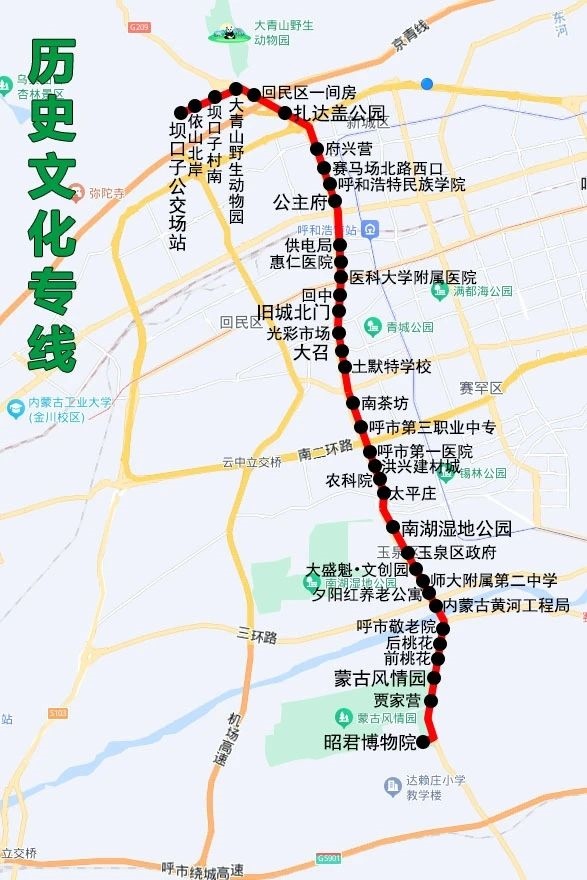 沿途設(shè)站:壩口子公交場(chǎng)站、依山北岸、壩口子村南、大青山野生動(dòng)物園、回民區(qū)一間房、扎達(dá)蓋公園、府興營(yíng)、賽馬場(chǎng)北路西口、呼和浩特民族學(xué)院、公主府、供電局、匯仁醫(yī)院、醫(yī)科大學(xué)附屬醫(yī)院、回中、舊城北門(mén)、光彩市場(chǎng)、大召、土默特學(xué)校、南茶坊、呼市第三職業(yè)中學(xué)、呼市第一醫(yī)院、洪興建材城、農(nóng)科院、太平莊、南湖濕地公園、玉泉區(qū)政府、大盛魁文創(chuàng)園、師大附屬第二中學(xué)、夕陽(yáng)紅養(yǎng)老公寓、內(nèi)蒙古黃河工程局、呼市敬老院、后桃花、前桃花、蒙古風(fēng)情園、賈家營(yíng)、昭君博物院。