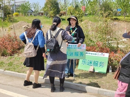 在音樂節(jié)會場外,一名手持“樂迷服務“導引牌的志愿者耐心為兩名樂迷指引入場方向。趙峰睿/攝