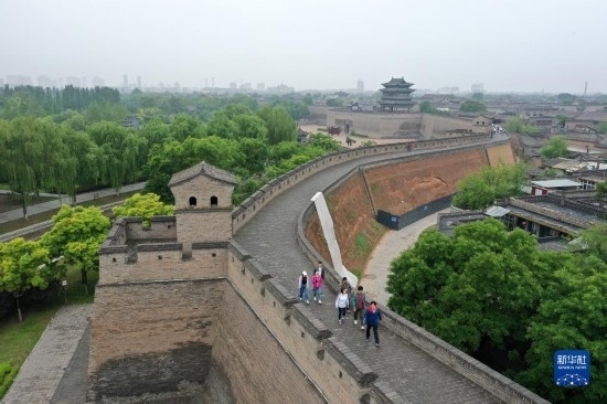 游客在平遙古城城墻上游覽(5月30日攝,無人機(jī)照片)。