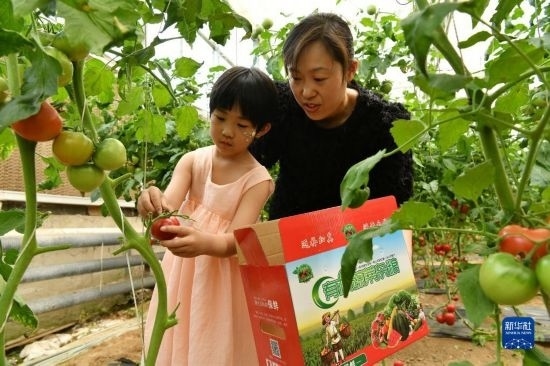 6月4日,游客在獻縣河城街鎮(zhèn)梅莊洼農(nóng)場大棚內(nèi)采摘西紅柿。