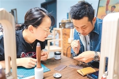 作為今年上海市為民辦實事項目“社會大美育課堂”的重要組成部分,今年上海市民藝術夜校春季班共開設教學點位123個、課程278門、招收學員6507人。夜校學習內容包括傳統(tǒng)文化、時尚文化、非遺技藝、江南文化以及區(qū)域文化等。圖為5月8日,上海市寶山區(qū)淞南鎮(zhèn)社區(qū)文化活動中心,老師(右)正在指導學生皮具制作技巧。王 初攝(人民圖片)