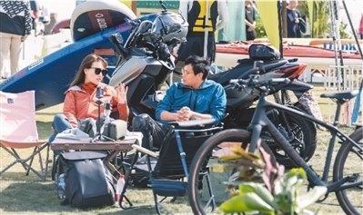 2023淀山湖(昆山)國際露營節(jié)在江蘇省昆山市舉行。露營節(jié)涵蓋露營裝備展、飛盤活動以及露營派對等內(nèi)容,滿足露營愛好者的多樣需求。圖為兩名游客在露營裝備展區(qū)交流。唐旭騁攝(人民視覺)