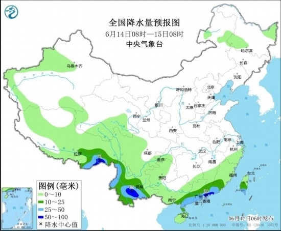 6月13日08時至14日08時,云南南部、廣西南部和東部、廣東大部、臺灣島中南部、西藏東南部等地有大雨,局部地區(qū)有暴雨(50~90毫米)。新疆東部等地有5~6級風(fēng)(見圖3)。