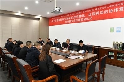 嵊州市委政法委、市法院、市檢察院、市公安局、市勞動(dòng)仲裁委聯(lián)合舉行《關(guān)于防范和制裁勞動(dòng)爭(zhēng)議虛假仲裁、虛假訴訟的協(xié)作意見(jiàn)》發(fā)布暨專項(xiàng)治理啟動(dòng)儀式。