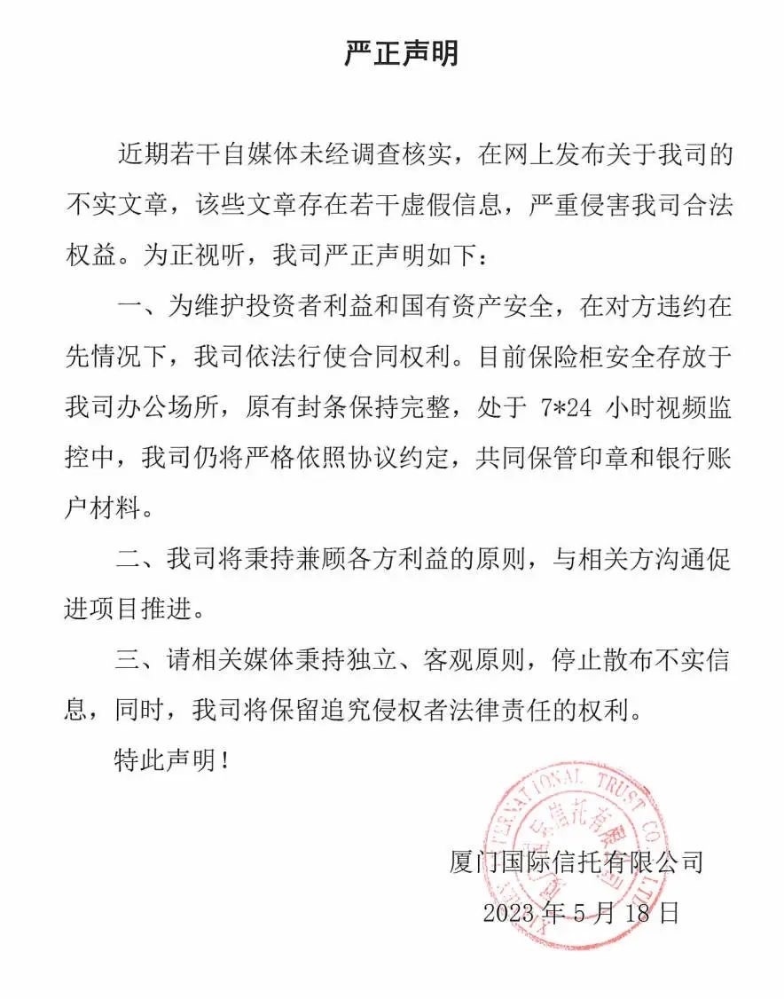 5月18日,廈門信托在官網(wǎng)和官方微信公眾號發(fā)布嚴(yán)正聲明稱,為維護(hù)投資者利益和國有資產(chǎn)安全,在對方違約在先情況下,我司依法行使合同權(quán)利。目前保險柜安全存放于我司辦公場所,原有封條保持完整,處于7*24小時視頻監(jiān)控中,我司仍將嚴(yán)格依照協(xié)議約定,共同保管印章和銀行賬戶材料。此外,我司將秉持兼顧各方利益的原則,與相關(guān)方溝通促進(jìn)項目推進(jìn)。