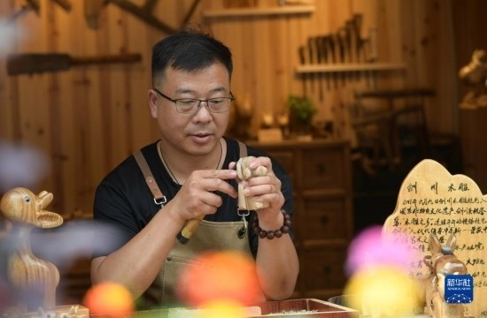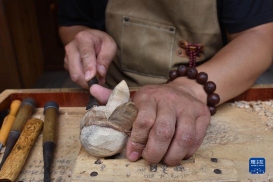 6月17日,一名手工藝人在鎮(zhèn)遠(yuǎn)古城一家木雕店雕刻工藝品。