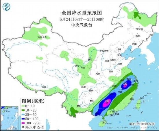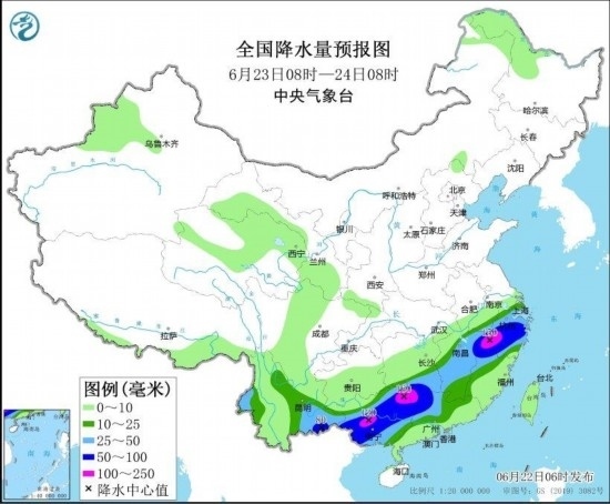 圖3 全國(guó)降水量預(yù)報(bào)圖(6月22日08時(shí)-23日08時(shí)) 圖自中央氣象臺(tái)網(wǎng)站