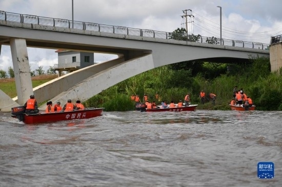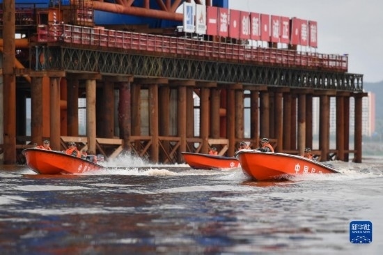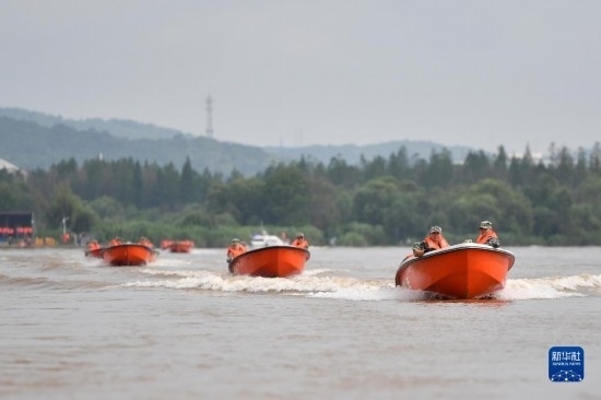6月26日,防汛搶險(xiǎn)應(yīng)急演練人員駕駛沖鋒舟巡邏。