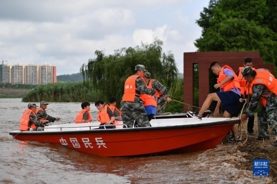 6月26日,防汛搶險(xiǎn)應(yīng)急演練人員駕駛沖鋒舟轉(zhuǎn)移“被困群眾”。