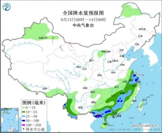 9月13日08時(shí)至14日08時(shí),江淮東部、江南中東部和南部、云南西部、華南大部等地部分地區(qū)有中到大雨,其中,江蘇中南部、上海北部、江西中南部、云南西部、廣西南部和東部、廣東西部等地部分地區(qū)有暴雨或大暴雨(100~150毫米)。甘肅河西部分地區(qū)有4~6級(jí)風(fēng),其中,新疆東部部分地區(qū)有7~8級(jí)風(fēng)。