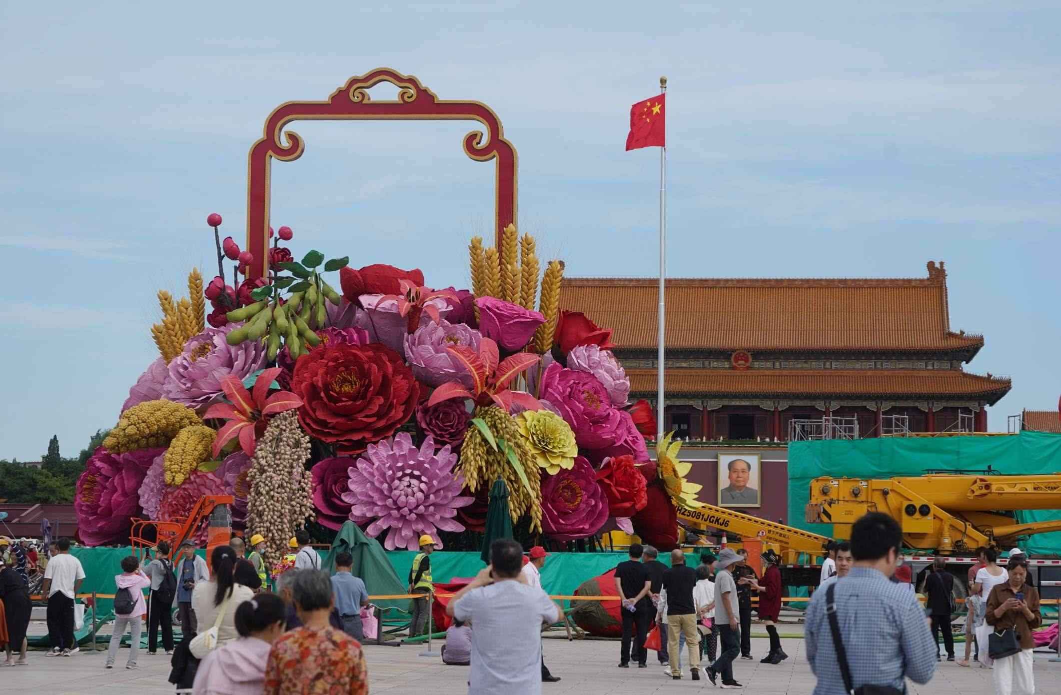 今年,天安門廣場中心的“祝福祖國”主題花壇以喜慶的花籃為主景。籃內選取了擁有美好寓意的花卉和喜慶豐收的五谷(水稻、小麥、小米、黃米、大豆),體現(xiàn)花團錦簇、五谷豐登。