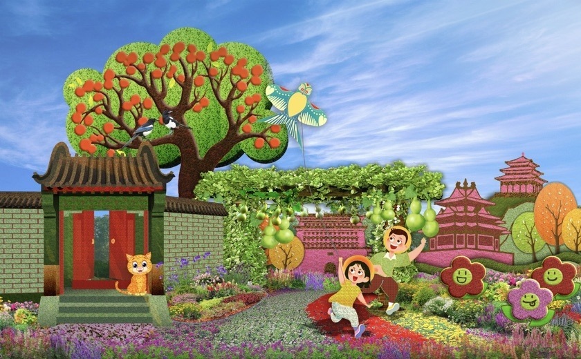 3,東單東南角的“共同富裕”主題花壇頂高達9.5米,以欣欣向榮的城鄉(xiāng)融合發(fā)展為場景,描繪了中國式現(xiàn)代化全體人民共同富裕的美好藍圖。