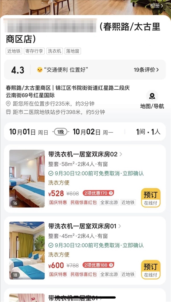▲位于成都市春熙路、太古里商區(qū)的某民宿一居室雙床房房型,國慶期間每晚單價(jià)為528元