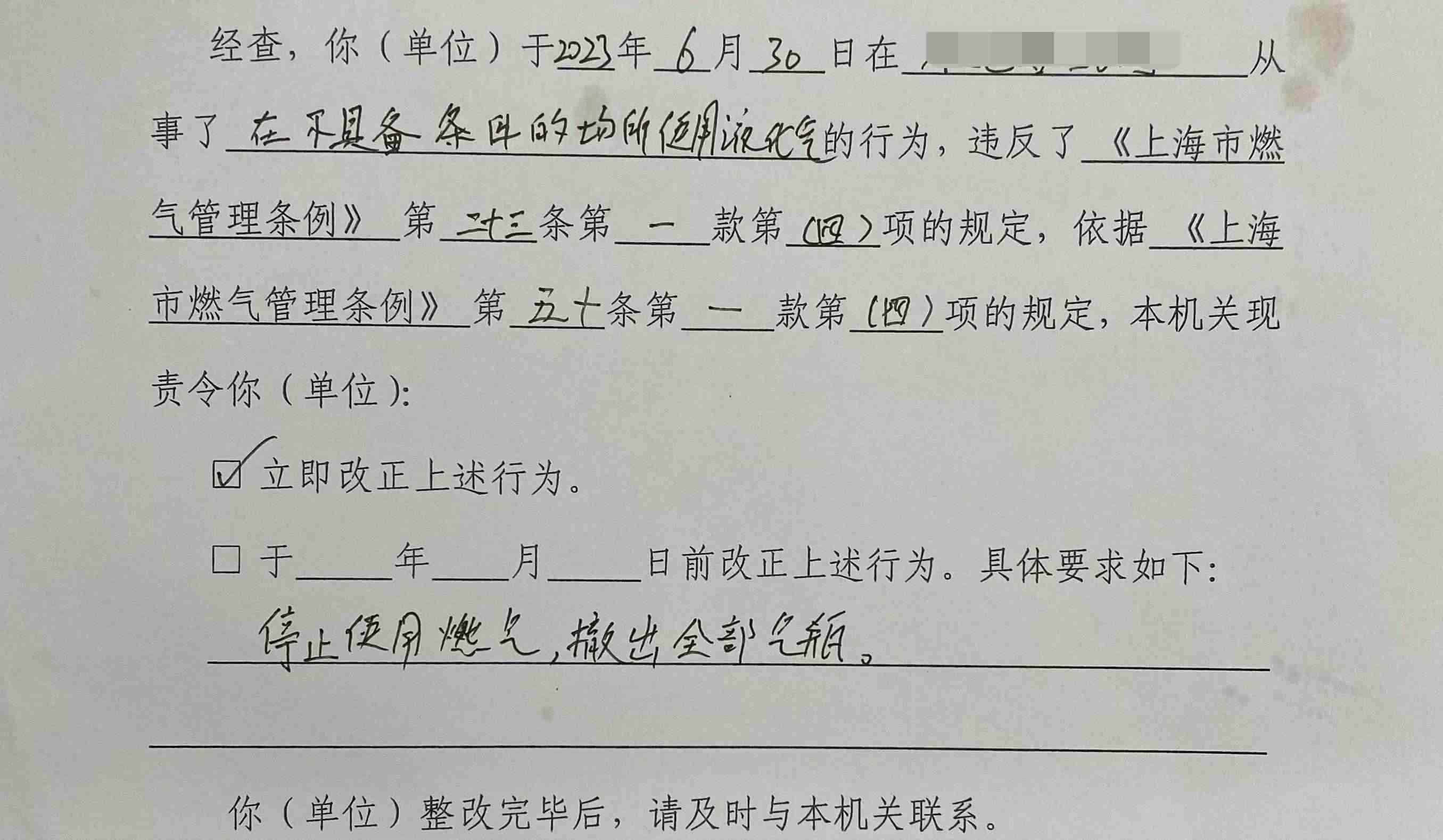 這并不是一次平常的燃?xì)庥猛旰蟾鼡Q空瓶。大概一個小時前,市住建委相關(guān)部門的檢查人員走進餐館,檢查后責(zé)令整改,并在整改完成前暫停燃?xì)夤?yīng)。