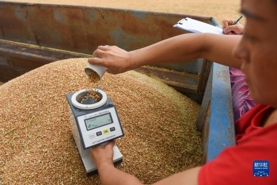 7月10日,在石嘴山市平羅縣姚伏鎮(zhèn),農(nóng)業(yè)工作者對小麥進行水分測量。