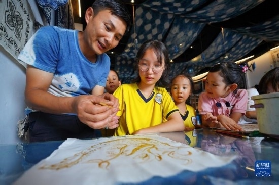 7月12日,在貴州省丹寨縣萬達(dá)小鎮(zhèn)一家苗族蠟染非遺體驗(yàn)館,小朋友在非遺傳承人的指導(dǎo)下畫蠟畫。