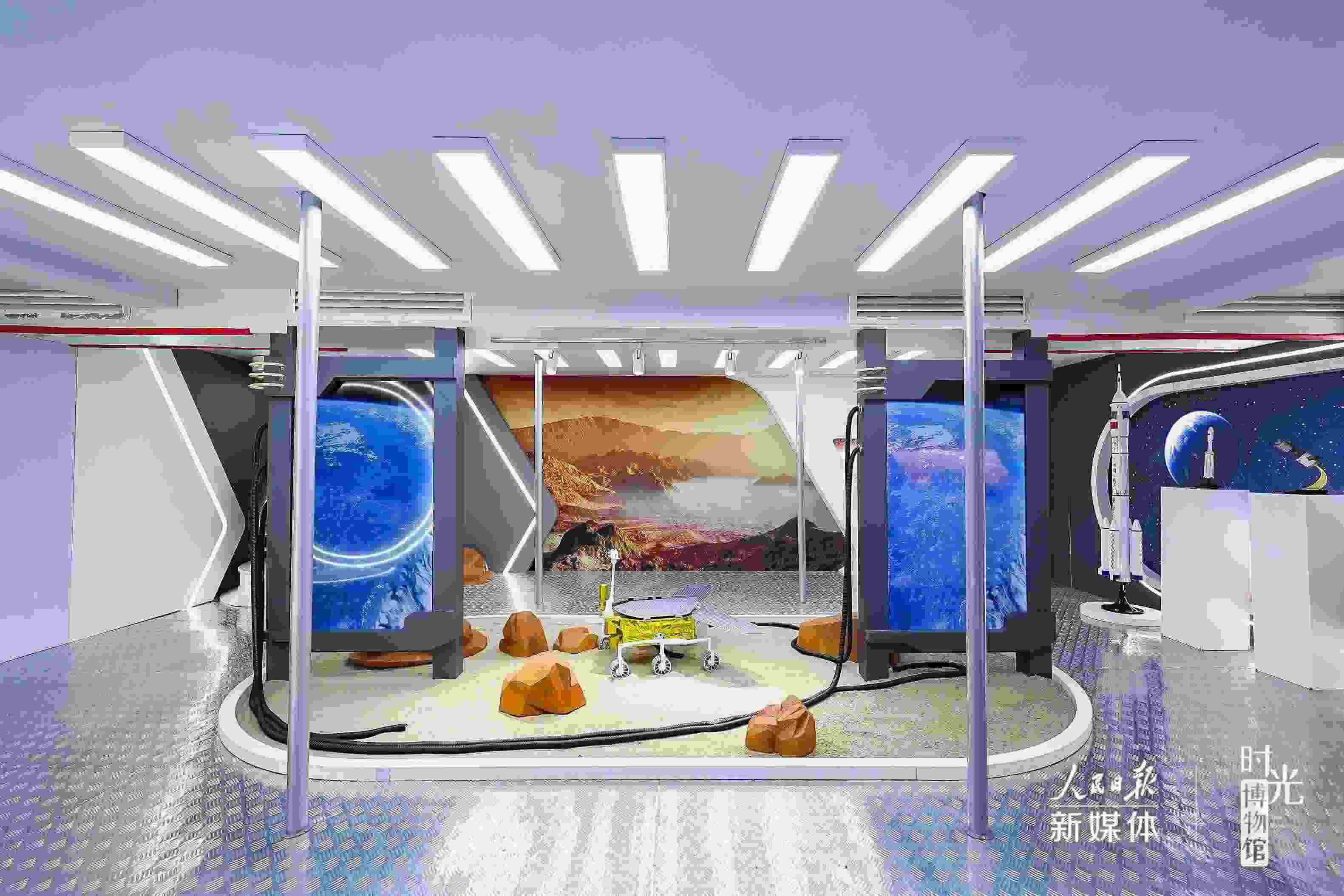 在“星辰大?!闭箙^(qū),航天器模型+視頻演示模擬真實的太空場景,復(fù)古電視機循環(huán)播放過去30年的航天大事件?!吧裰邸憋w天、“天宮”遨游、“嫦娥”攬月、“祝融”探火……將浪漫灑向宇宙,構(gòu)成了中國人獨有的星辰大海。