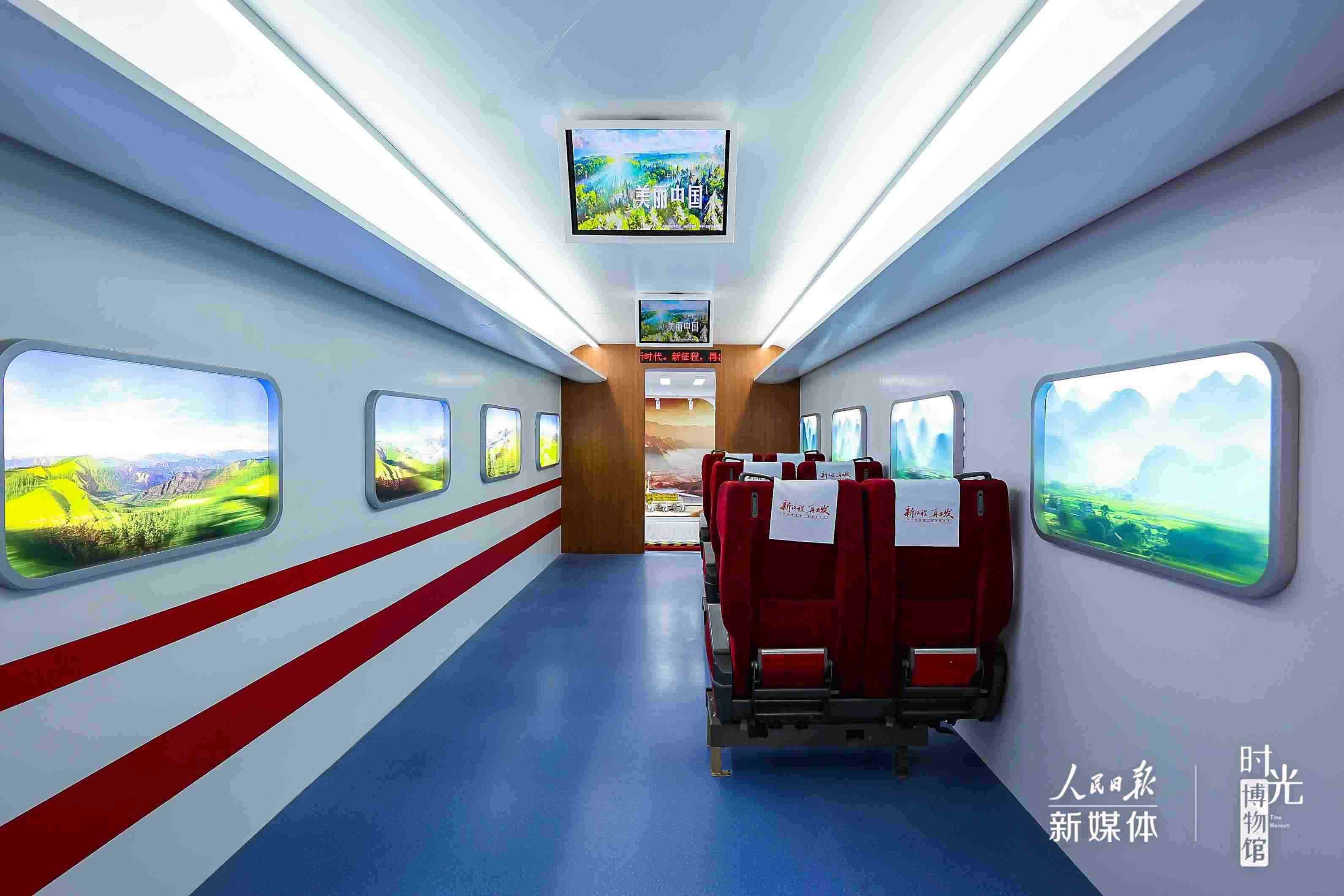 走進這座由兩輛雙層雙擴容特裝巨型箱體車改裝的“紅房子”里,“復(fù)興號”高鐵、“天宮”空間站、古今融合的《新千里江山圖》一一映入眼簾??赏垦b的盾構(gòu)機、可云游的長城、AR觀影……“實物+影像+互動體驗”組成的展區(qū),呈現(xiàn)著新時代十年的非凡成就。