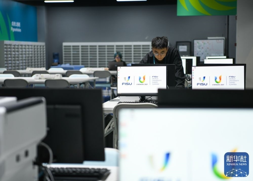 ↑7月13日,在成都大運(yùn)會(huì)主媒體中心,工作人員正在調(diào)試媒體工作間的電腦。新華社記者 王曦 攝