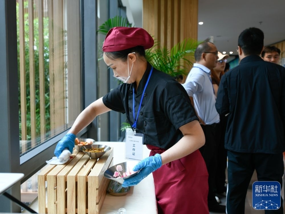 ↑這是7月14日拍攝的成都大運(yùn)會(huì)主媒體中心媒體餐廳內(nèi)菜品。新華社記者 胥冰潔 攝