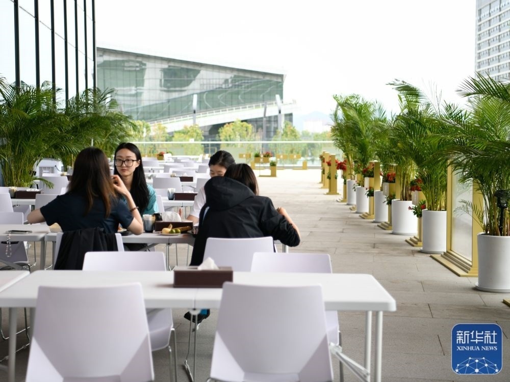 ↑7月14日,工作人員在成都大運(yùn)會(huì)主媒體中心媒體餐廳室外就餐區(qū)就餐。新華社記者 胥冰潔 攝