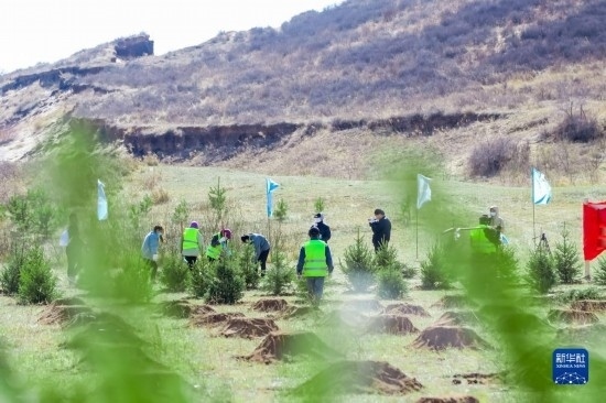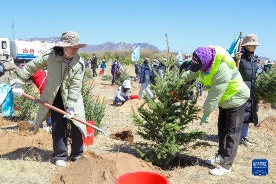 志愿者在內(nèi)蒙古渾善達克沙地栽種沙地云杉(2023年4月22日攝)。新華社記者 李云平 攝