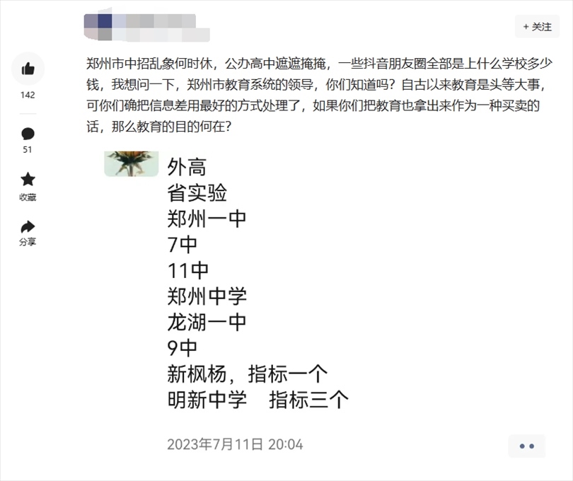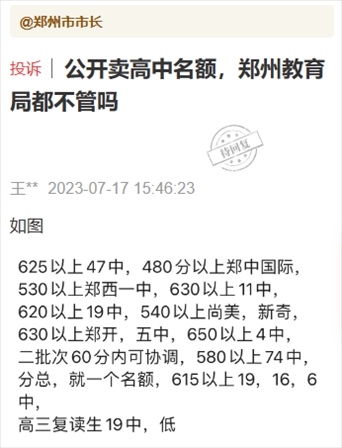 7月16日,有群眾通過頂端新聞“我想@領(lǐng)導(dǎo)”平臺(tái)向鄭州市教育局局長留言:“掏錢就能上?鄭州中招販賣名額成風(fēng)”“公開賣高中名額,鄭州教育局都不管嗎”等類似留言。
