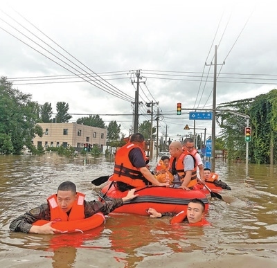 7月31日,武警北京總隊官兵在北京市房山區(qū)轉(zhuǎn)移被困群眾。當日,共轉(zhuǎn)移6個村莊被困群眾676人,協(xié)助轉(zhuǎn)運物資1000余件。李卓爾 王 斌攝影報道