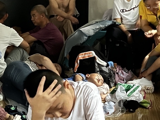 汗味兒、腳臭味兒、霉味兒攪和在一起,溫宇被“熏得頭暈”。室內(nèi)的椅子被搶占一空,講演臺(tái)上睡滿了打地鋪的乘客。幾乎所有人都表情木然,“累得不想說(shuō)話”。