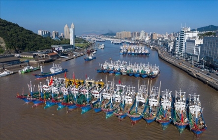 8月6日,停泊在舟山普陀沈家門(mén)漁港的漁船即將出港。專項(xiàng)特許捕撈漁船結(jié)束休漁,于6日開(kāi)赴東海海域,進(jìn)行捕撈作業(yè)。
