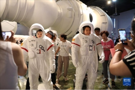 小朋友們?cè)谖挥谏蜿?yáng)市的遼寧省科技館里航天展區(qū)參觀留影。